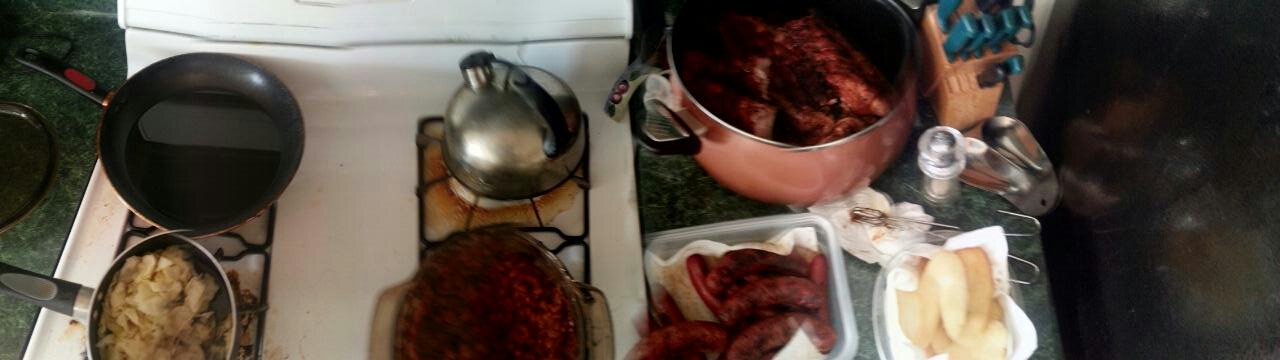 “This makes me happy: hot water cornbread, bratwurst, hot dogs, ribs, baked beans, and cabbage.” – Arlandus